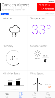 c) Observations – will provide an animated graphical display of the latest weather measurements from a list of 133 locations in Australia. Data shown includes weather, temperature, relative humidity, sunrise/sunset times, minimum and maximum temperatures and wind speed and direction. Drag the table up to show the forecast for that location and drag down to refresh the current data.